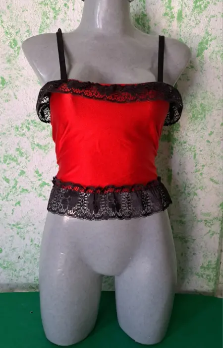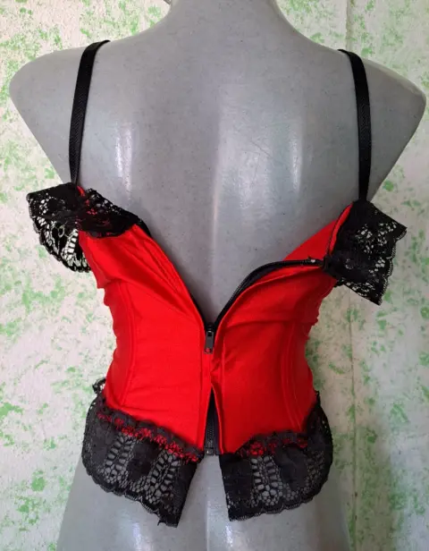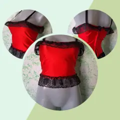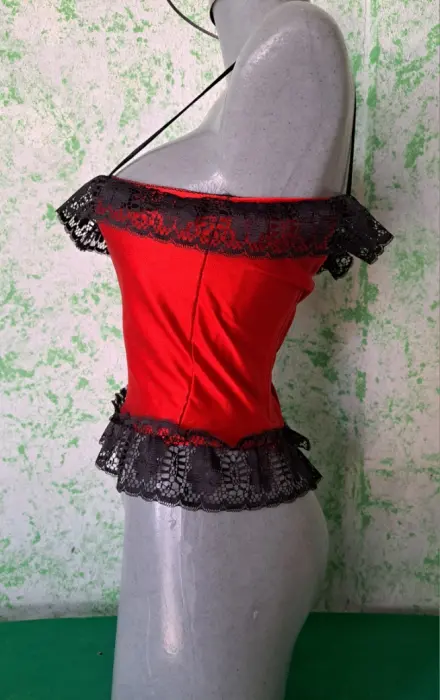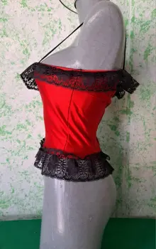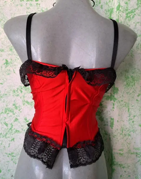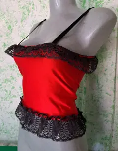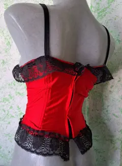 Coqueto corset corto color rojo, con toques de encaje que lo hacen lucir muy sexy, tiene cierre en la espalda, es talla mediana, la tela tiene tolerancia es estirarse, se encuentra en buenas condiciones.
