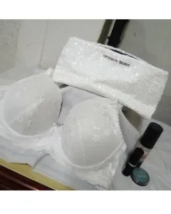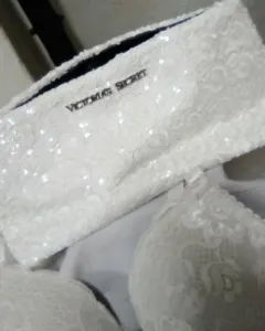 Paquete de cosmetiquera victorias'secret y brasier Carnival. Cosmetiquera con chaquira blanca la puedes ocupar hasta como bolsa de noche está linda el brasier es Carnival blanco con encaje talla 38 B muy coqueto