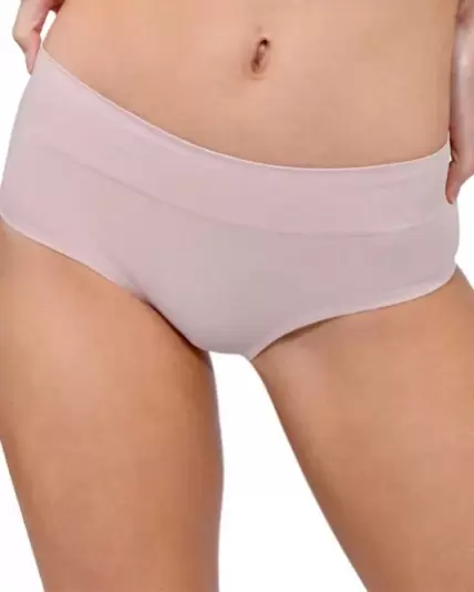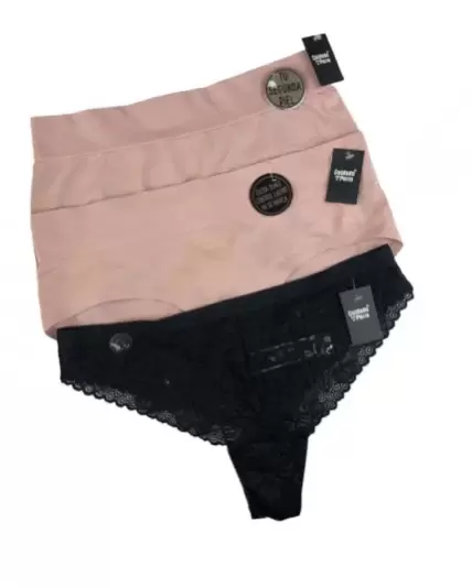 Paquete de pantie, bóxer y tanga. El paquete contiene un bóxer beige, un pantie beige y una tanga de encaje negro todo en talla M.