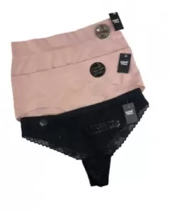 El paquete contiene un bóxer beige, un pantie beige y una tanga de encaje negro todo en talla M.
