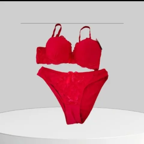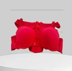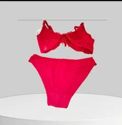 Set de 2-Piezas Panty y Brassier de Pick Pink, talla 42(XXL), color Rojo passion, con encajes de acento en Brassier y moño coquette en el Panty, hechos de licra y algodón, nuevos a estrenar con etiqueta en buen estado cosmetico.