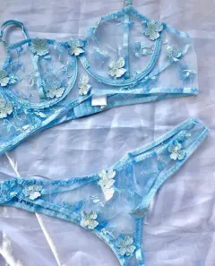 Set de lencería azul totalmente nuevo talla L-XL, tiene 3 niveles de ajustado del brasier además de que los tirantes son ajustable , la tela es tipo red transparente azul con flores azules de encaje