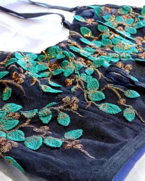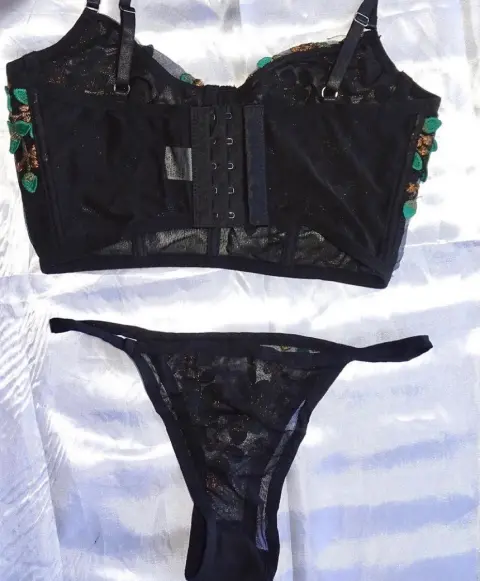 Set de lencería negro totalmente nuevo talla XS-S, tiene 3 niveles de ajustado del brasier además de que los tirantes son ajustable , la tela es tipo red transparente negra con hojas verdes y doradas de encaje