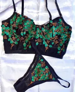 Set de lencería negro con hojas verdes y doradas
