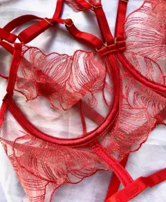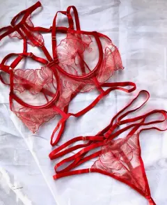 Set de lencería rojo totalmente nuevo talla S-M, todos los tirantes son ajustable , la tela es tipo red transparente roja con flores/hojas rojas de encaje