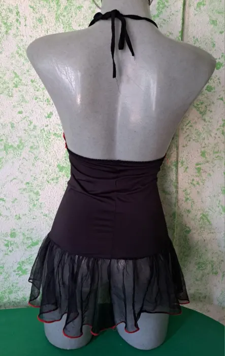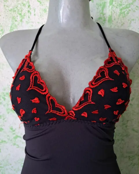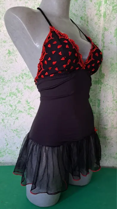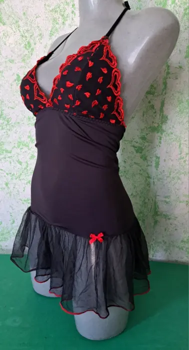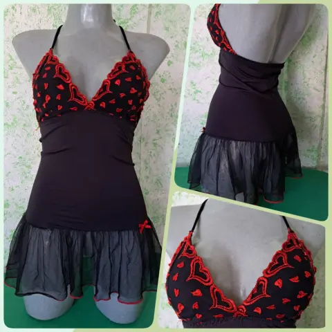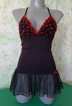 Lindo baby doll negro con estampado de corazones en las copas, el olan de la falda se transparenta por lo cual luce muy sexy, la tela tiene tolerancia a estirarse, es talla chica, se encuentra en buenas condiciones.