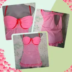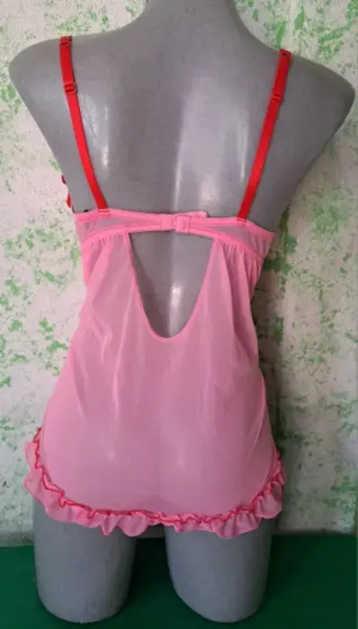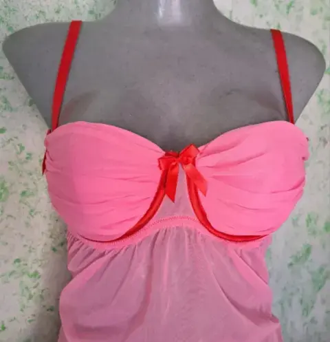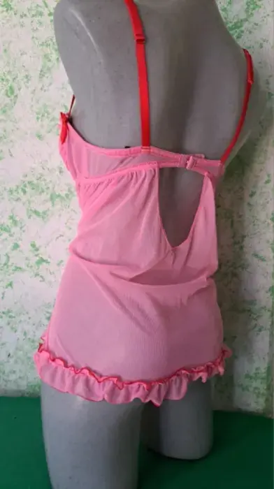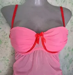 Lindo baby doll rosa, con toques de listón y efecto corrugado en las copas, luce muy romántico y sexy, es talla mediana, se encuentra en excelentes condiciones.