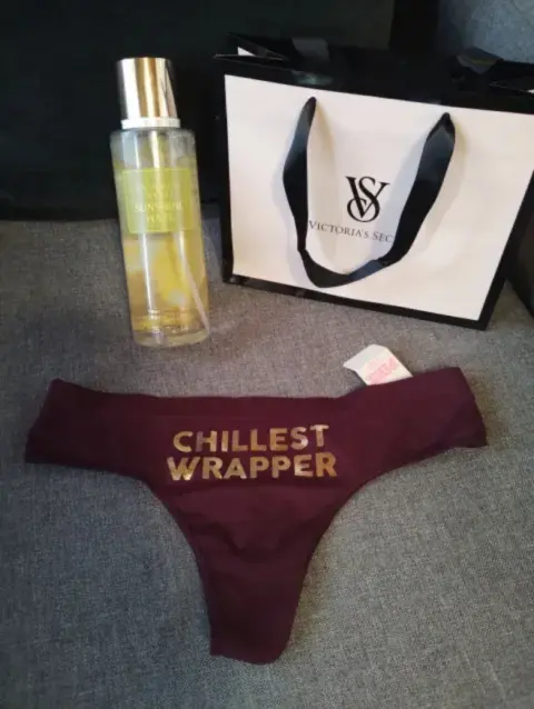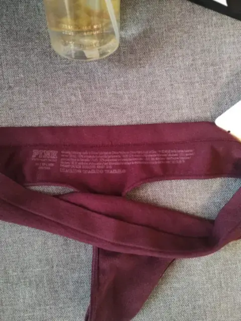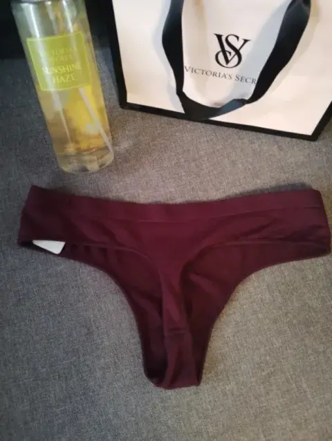 Tanga con mist fragancia regalo victoria secrets. Hermosa tanga color vino con frase impresa en letras doradas de algodón con licra talla XS.En la compra de esta prenda te llevas de regalo 🎁 un mist sunshine haze aroma floral de 250 ML .