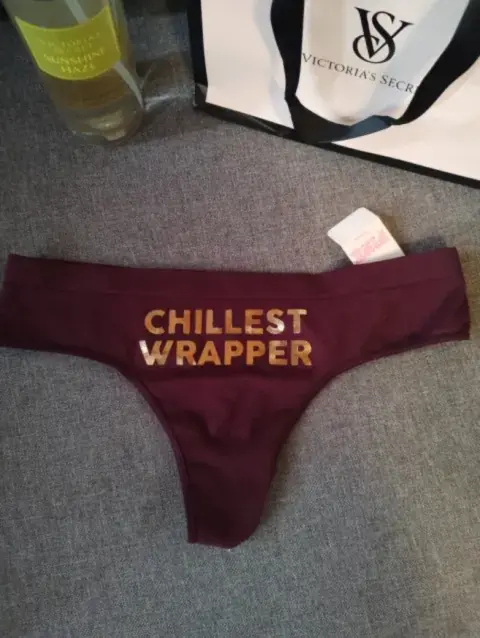 Hermosa tanga color vino con frase impresa en letras doradas de algodón con licra talla XS.En la compra de esta prenda te llevas de regalo 🎁 un mist sunshine haze aroma floral de 250 ML .