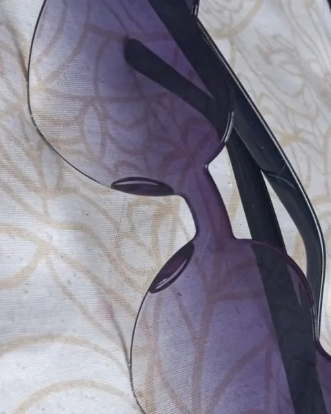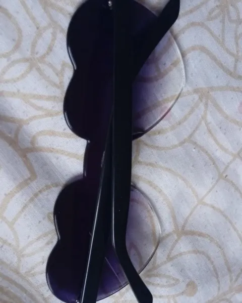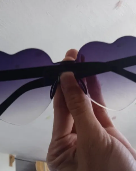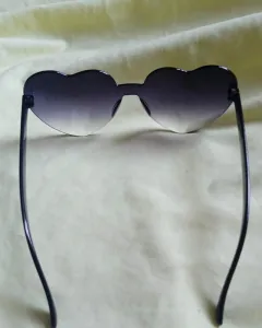 Lentes de sol en forma de corazón sin montura, sin marco. Son degradados en negro a violeta. Tamaño grande. Lucen hermosos puestos.