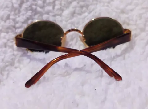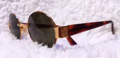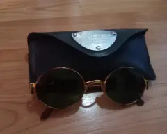 Gafas de sol ovaladas unisex anticuadas, VOGART by Police vintage 90, mod. 3504, marco de metal tono dorado con lentes negras originales en perfecto estado, patillas delgadas con detalle y logotipo en tono dorado.Signos menores de desgaste en puente