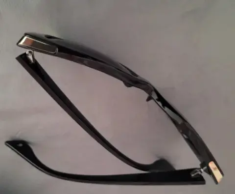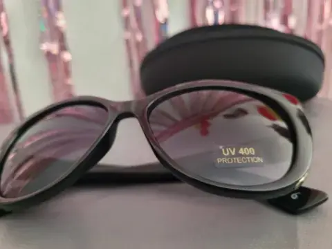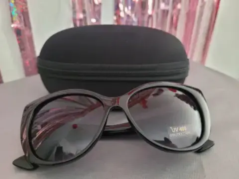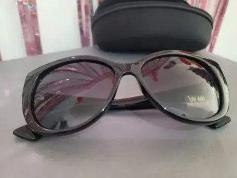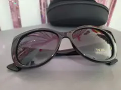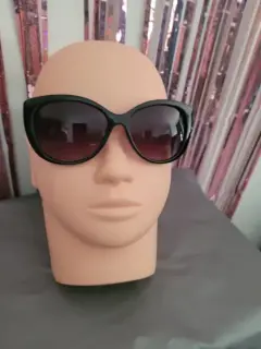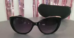 Marco y brazos de policarbonato, marco con detalle de metal, micas negras de 14.3 cms, con estuche. Protección UV.