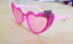NUEVOSHechos a manoLentes de solDe BarbieColor rosaCon cristales rosasCon figura de la silueta de Barbie con brillosTamaño infantil¡¡Ningún desperfecto!!