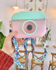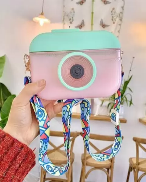 Cantimplora en forma de cámara color rosita con verde. Totalmente nueva. Incluye listón para colgar. Capacidad de 400 ml