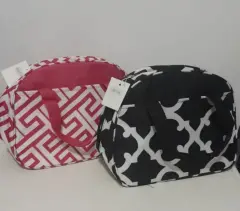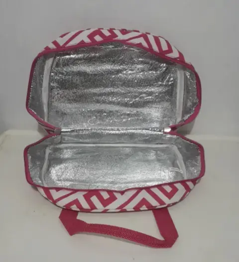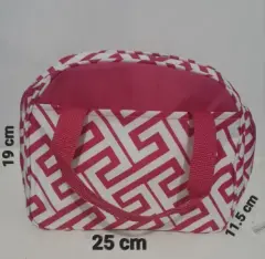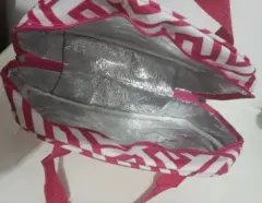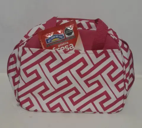 Bonita y práctica lonchera, con zipper doble para abrir hacia ambos lados, bolsas por fuera, interior térmico. Disponible solo blanco- fushia. Medidas: 25x19x11.5 cm