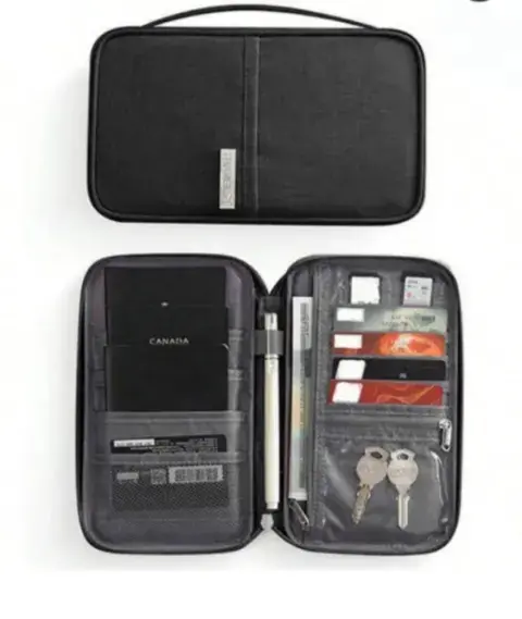 Bolsa de viaje portadocumentos. Práctica bolsa de almacenamiento para viaje, color negro. Nueva, es impermeable.Con 2 bolsas en el exterior, en la bolsa principal tiene tiene 11 compartimentos y para pluma.Material tela tipo lona impermeable.En las últimas fotos puedes ver las medidas