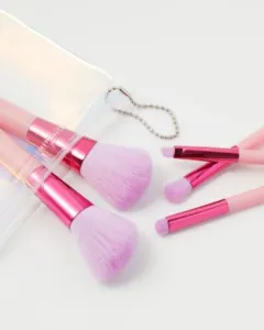 Kit de minibrochas para maquillar. Set de cinco brochas de maquillaje para rostro y ojos que te permiten combinar una gran variedad de técnicas, vienen en un práctico estuche color tornasol.