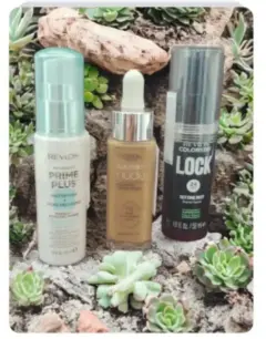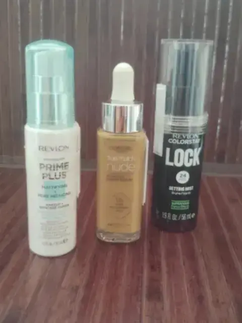 Kit de productos para el cuidado de la cara. El primero de la botella blanca de Revlon , es un primer plus (con dos gotitas lo aplicas en toda la cara antes del maquillaje), después puedes utilizar el sérum Rellenador con ácido hialurónico de color de la marca de LOREAL (puede funcionar como maquillaje muy ligero en cobertura) y por último el de la botella negra es un spray fijador de la marca de Revlon, su objetivo es sellar el maquillaje.