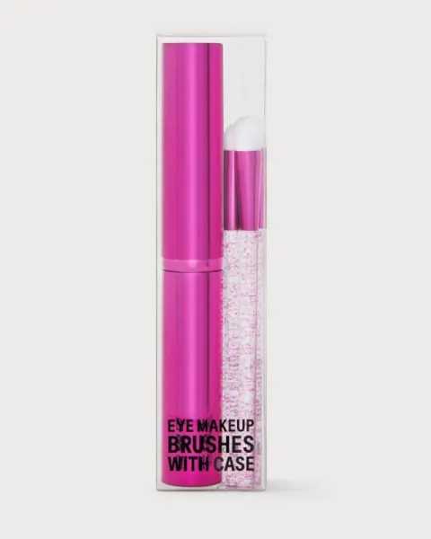 Juego de cinco brochas de maquillaje en un práctico estuche color morado metálico.💜