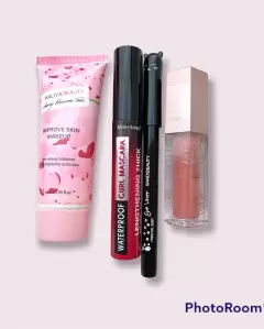 Set de 4 productos para la cara 1 primer con aroma a cereza 1 Mascara de pestañas 36H 1 Delineador negro con diseño de gato 1 Corrector Master skin