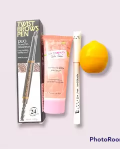 1 delineador de ceja con cepillo 1 primer de rosas 1 bálsamo labial de limón (con aroma) 1 delineador negro de ojos