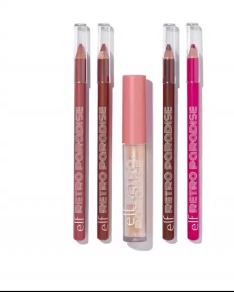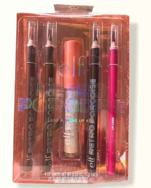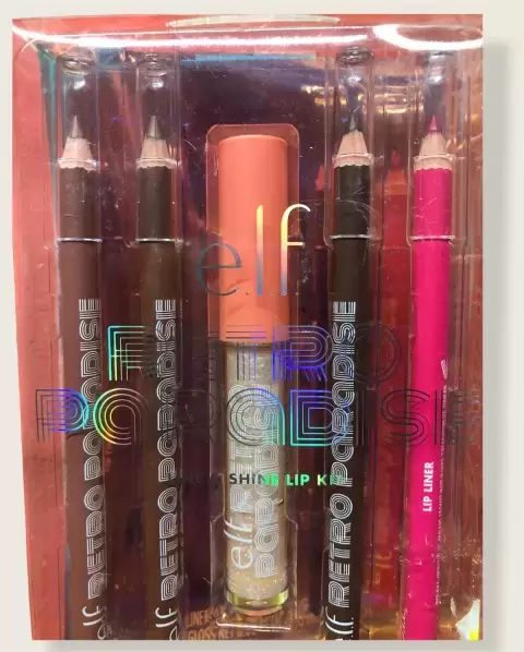 Retro paradise line &shine lip Kit elf delineador con brillosDefine , esculpe y llene sus labios con estos revestimientos cremosos y pigmentos inspirados en pinturas en las Bahamas . Déjalo mate , o encima de tu aspecto de labios con el brillo brillante para un toque adicional ,1. 4 delineadores de labios nude2. 1 brilló de labiosOriginal / nuevo / directo de e.u