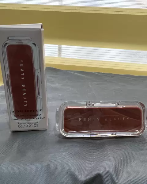 Iluminador para labios FB. Tu brillo de labios favorito ahora se vierte en una bandeja portátil con clip para llevarlo a todas partes, en el icónico tono rosa nude universal, Fenty Glow.