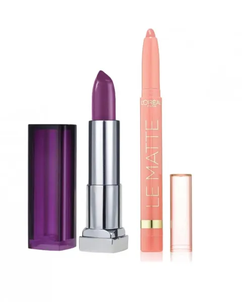 Labial Color Sesarional de Maybelline, color 405 pretty in Plum + Lápiz labial LE MATTE color Rosa de L’Oréal.