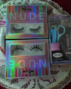 Kit pestañas, pegamento y enchinador. 2 pares de pestañas diferentes formas1 pegamento para pestañas color negro a prueba de agua1 kit que incluye: enchinador de pestañas, pinzas para cejas.Kits para cutícula de uña