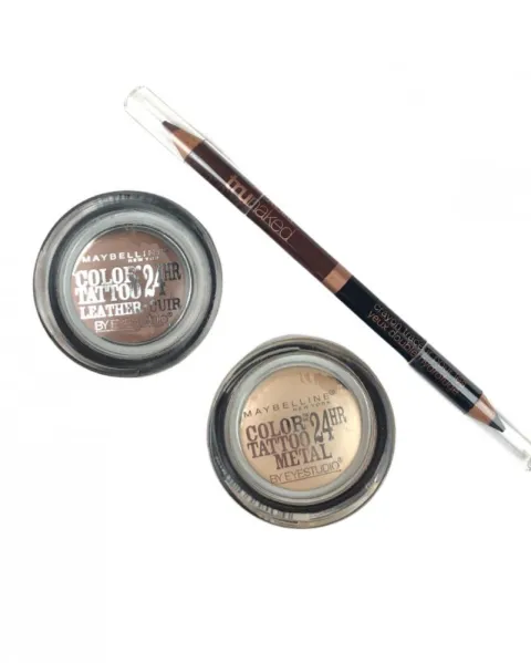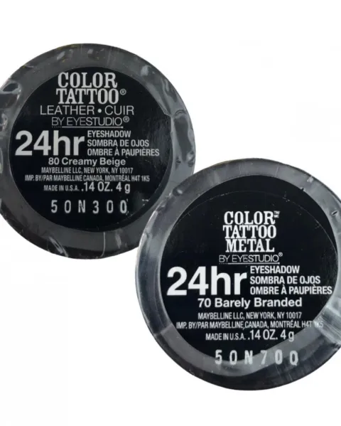 Pack 2 Sombras Color Tatto + delineador. Llévate 2 Sombras de ojos Color Tattoo 24 hrs. de Maybelline , color 70 Barely Branded y 80 Creamy Beige + un lápiz delineador Trunaked de Covergirl de doble punta Moka y Negro Ebony.