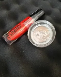 Pack labial y sombra en crema. DúoLabial líquido wet n wild tono rojo Sombra en crema Maybelline tono café