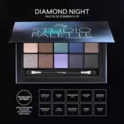 Paleta de sombras Studio Look Diamond Night cyzone. Studio Look Diamond Night trae 10 tonos mega pigmentados y profundos. Tienen acabado mate, satinado y shimmer. Con Tecnología Wet & Dry aumenta la intensidad del color al contacto con el agua. Su fórmula contiene Vitamina B3Precio de catálogo y tienda en línea: $580