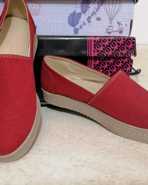 Hermosos sneakers. Hermosos mocasines tipo sneakers. En lona roja con suela sintética simulando mecate.