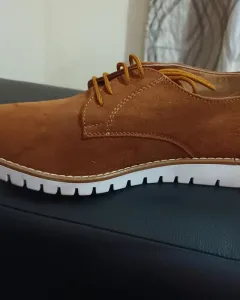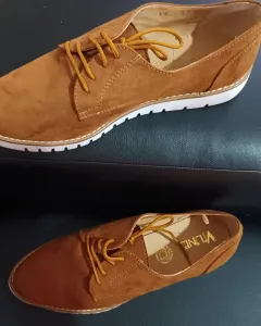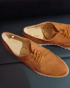 Mocasines de gamuza cafes, con agujetas y suela antiderrapante, talla 4