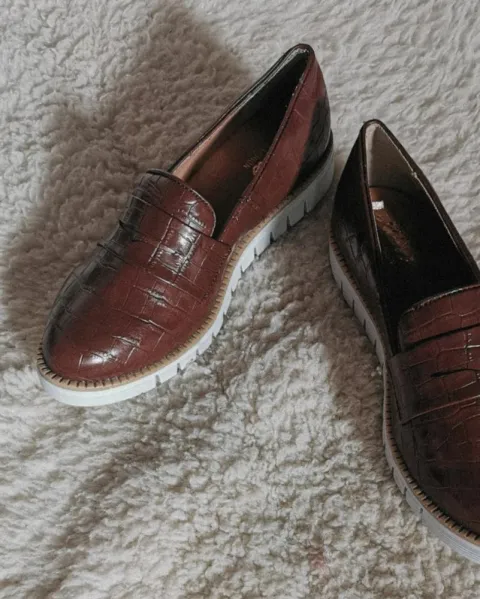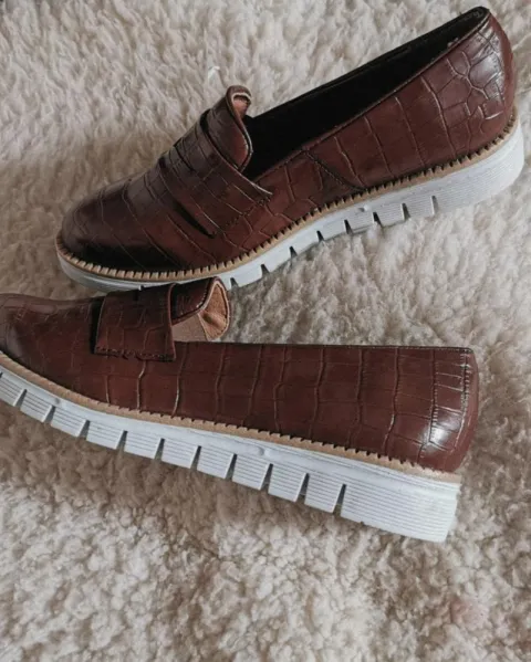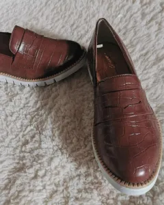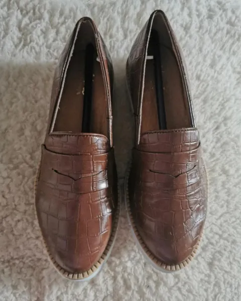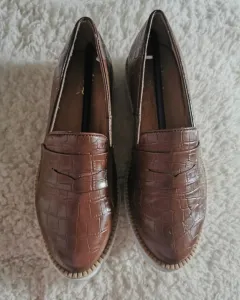 Mocasines color cognacForro sintético tipo piel de cocodrilo color cognac.Son totalmente nuevos.En la etiqueta dicen 24.5 pero en realidad le van bien a un 24 vienen reducidos.