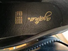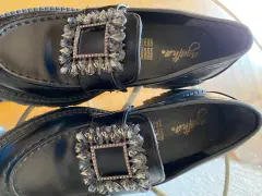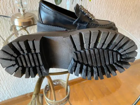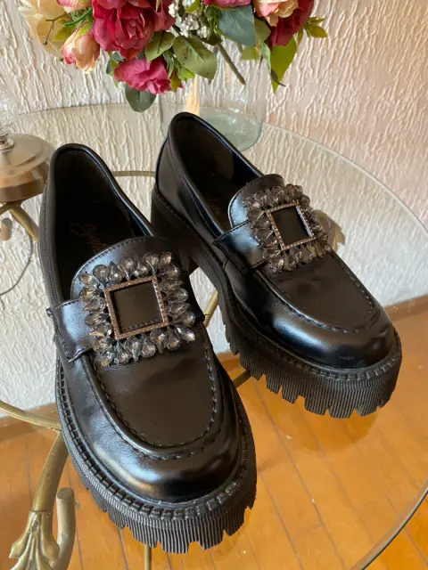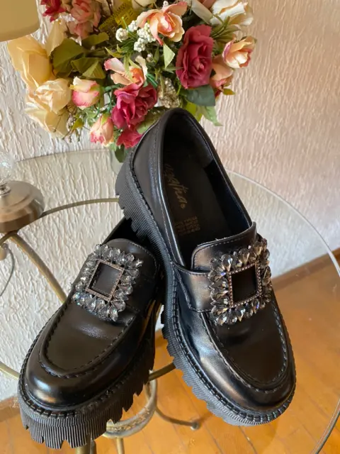 Mocasines color negro con broche de piedras, del #3 con suela ancha de 3 cms, tacón 5 cms, corte sintetico, muy cómodos vienen a la talla excelente estado