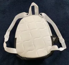 Backpack blanco y negro. Agarraderas laterales. Compartimentos internos y externos. Material 100% poliéster. Medidas 19 cms de ancho 23 cms de alto 9 cms de profundidad