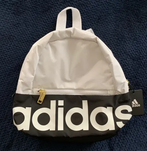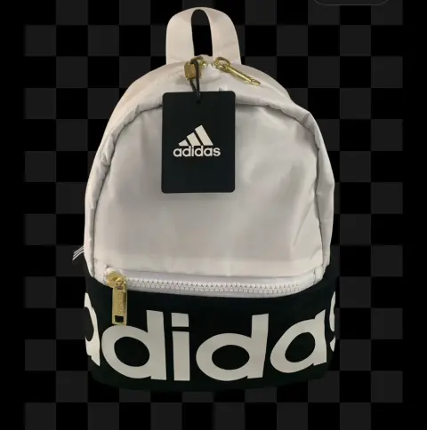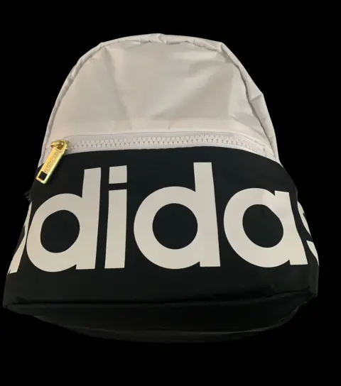 Back pack marca Adidas. Backpack blanco y negro. Agarraderas laterales. Compartimentos internos y externos. Material 100% poliéster. Medidas 19 cms de ancho 23 cms de alto 9 cms de profundidad