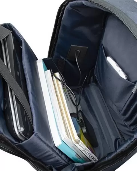 Backpack Anti-robo 15.6" incluye cable USB, color azul mezclilla, ideal para guardar tu laptop y libretas.Nueva, lista para estrenar.