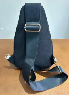 Blackpack negro con blanco con una sola correa ancha y ajustar el largo y el lado que prefieras usarla. Diseño en forma de triángulo. Bolsas delanteras con cierre. Holograma bordado. Charm de la marca en forma de corazón. Medidas 20 cms de frente 33 cms de alto 8 cms de profundidad
