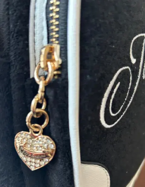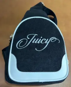 Backpack Juicy negro con blanco. Blackpack negro con blanco con una sola correa ancha y ajustar el largo y el lado que prefieras usarla. Diseño en forma de triángulo. Bolsas delanteras con cierre. Holograma bordado. Charm de la marca en forma de corazón. Medidas 20 cms de frente 33 cms de alto 8 cms de profundidad