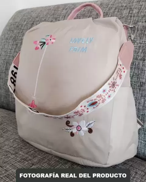 Mochila beige nueva, bordada, super bonita, cómoda, antirobo