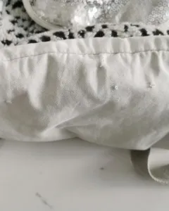 La mochila es de varias telas, al frente es de tela afelpada con animal print, la parte de atras y el fondo es de tela tipo loneta color blanco y la tapa de la mochila y la bolsa es de tela con lentejuelas pmateadas. Como se ve en la foto, algunas de las lentejuelas han perdido su brillo y quedaron transparentes.