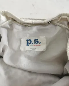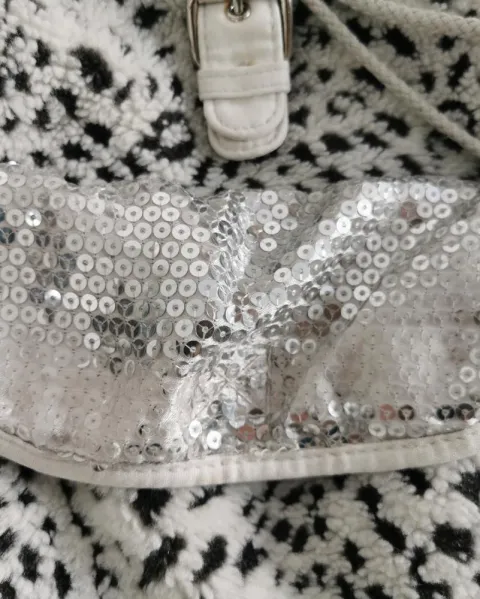 Mochila blanca P.S. de Aeropostale. La mochila es de varias telas, al frente es de tela afelpada con animal print, la parte de atras y el fondo es de tela tipo loneta color blanco y la tapa de la mochila y la bolsa es de tela con lentejuelas pmateadas. Como se ve en la foto, algunas de las lentejuelas han perdido su brillo y quedaron transparentes.