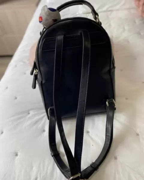 Backpack material liso y construcción rígida. El logo es un herraje de metal en acabado al alto brillo y una técnica de esmaltado a tono. Mascada como accesorio adicional, es removible y multi uso. Asas traseras ajustable. Material Sintético. Medidas: 29x23x9cm.