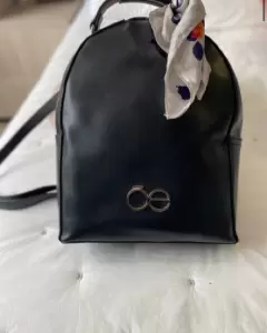 Mochila Cloe. Backpack material liso y construcción rígida. El logo es un herraje de metal en acabado al alto brillo y una técnica de esmaltado a tono. Mascada como accesorio adicional, es removible y multi uso. Asas traseras ajustable. Material Sintético. Medidas: 29x23x9cm.