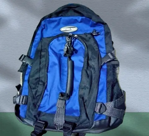 Mochila para camping.Tiene 2 bolsas exteriores, dos manijas para sostenerla, una enfrente y una arriba.Tiene broches en los lados y abajo para que tenga mayor capacidad.En ambos lados tiene una malla para poner botellas o más cosas.En la parte trasera tiene broches para ajustarse al pecho, así como en la cintura.Tiene un defecto de fábrica, descosida una tira de los lados. Mide 48x35x14cm