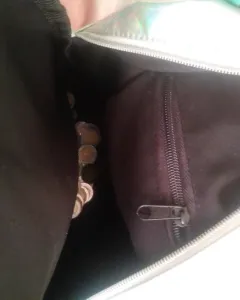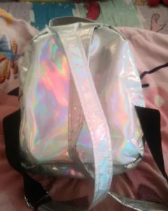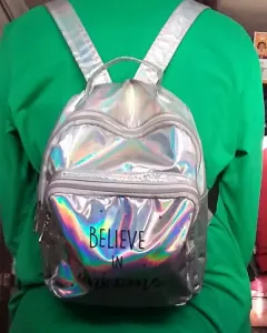 Bonita mochila de tipi holográfica, tiene bolsa enfrente y una frase de unicornio, tiene aza y en la parte de adentro es espaciosa y tiene una pequeña bolsa adentro, es ajustable el tamaño de como desee usarse