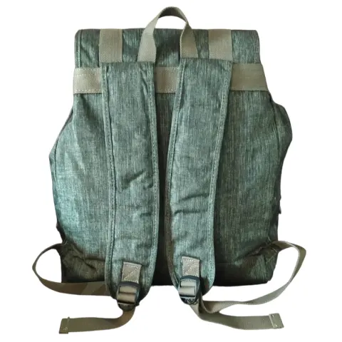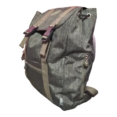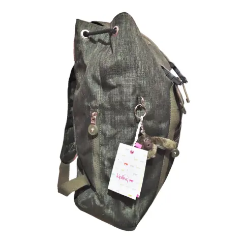 Mochila Kipling verde militar con dos bolsas accesorias al frente, broches y jaretas para cerrar el compartimiento principal, dos cierres laterales y asas ajustables y acolchadas. Forro interno textil.Alto 44 cm.Ancho 47 cm.Fuelle 13 cm.