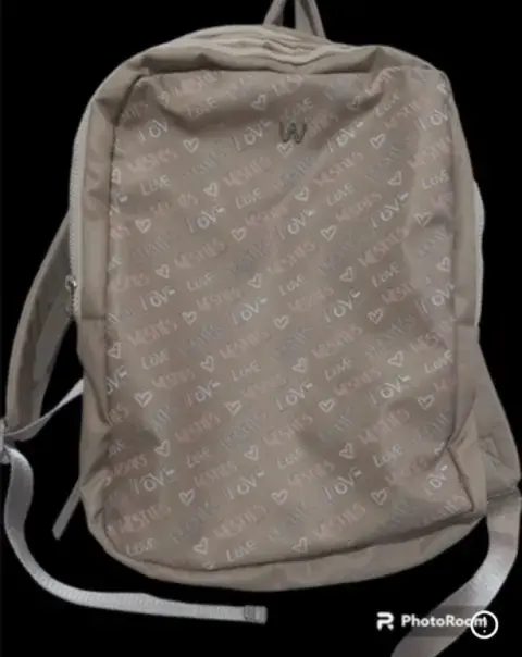 Hermosa mochila Westies color beige, tiene 3 compartimentos bolsas a los lados. Cabe una lap, ideal para escuela